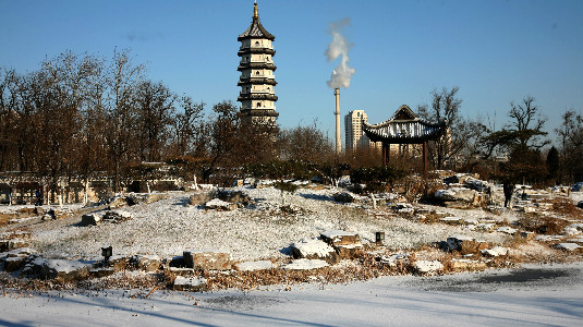 The sun shines brightly in the cloudless blue sky. The tower's top, pavilion eaves, artificial hills and the ground seem to be covered by a layer of salt. Smoke from the chimney in the distance warms up the snowy scene. Creator/Source: Hebei District Cyberspace Administration