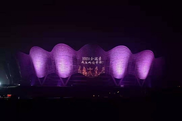 The "Enjoy Chinese New Year in Xi'an" video lights up the facade of the stadium of Xi'an Olympic Sports Center on Jan 16, sending out a warm invitation to the world.