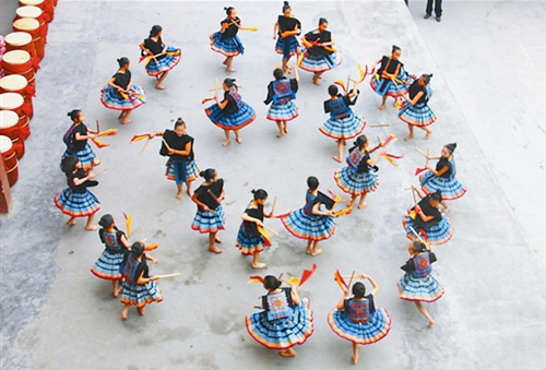 On Dec 26, girls of the Bai Ku-yao ethnic group at Lihu Yao Village Central Primary School in Nandan county, Hechi, Guangxi Zhuang autonomous region, practiced the traditional folk culture of monkey stick dancing during their break times.