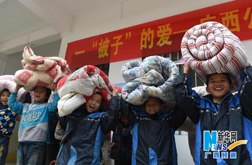 On Jan 6, volunteers of eight commonwealth groups, such as Amway and China Mobile Communications Corporation, sent cotton quilts to 255 students of the Nongyong Primary School in Bansheng village, Dahua Yao autonomous county, Hechi, Guangxi Zhuang autonomous region, in order to defend against the cold and provide warmth to the children in the freezing winter.
