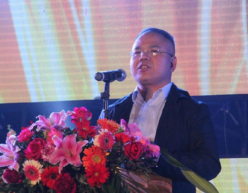Huang Rongbiao, secretary of the Party committee of the Huanjiang Maonan autonomous county, makes a speech before the start of the Huanjiang Dazzling Night, on Jan 13. [Photo by Lan Caiyun/Xinhua] |