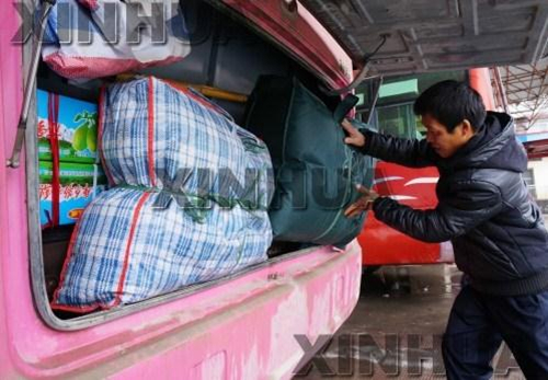 A passenger squeezes his luggage into an already-full luggage compartment at a bus station in the Rongshui Miao autonomous county, Liuzhou, Guangxi, on Feb 4. [Photo by Long Tao/Xinhua] |