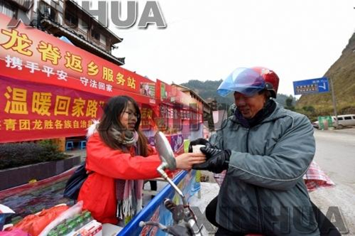 A volunteer provides a hot ginger drink to a driver heading to his hometown in the Longsheng Ge autonomous county, Guilin, Guangxi, on Feb 4. [Photo by Wei Jiyang/Xinhua] |