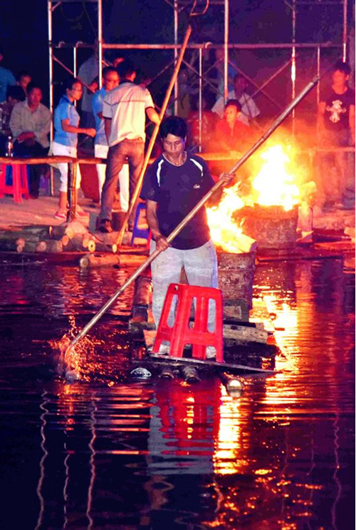 | A man lights a bonfire by a raft. [Photo by Gao Dongfeng/Xinhua] |