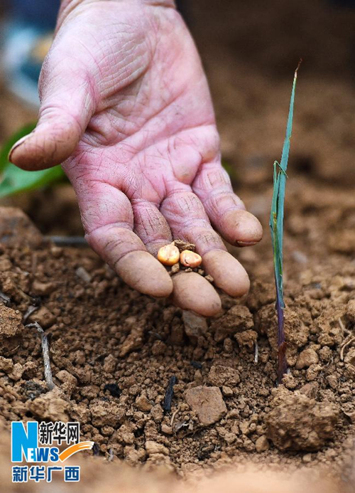 A farmer shows corn that failed to sprout due to the drought in Ren'an village, Fengshan county, Hechi, on April 23. [Photo by Zhang Ailin/Xinhua] |