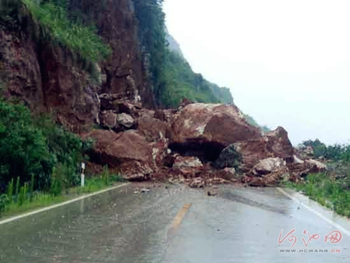 The road in Dahua, Hechi, is interrupted by landslides caused by heavy rain. [Photo by Gao Dongfeng/hcwang.cn] |