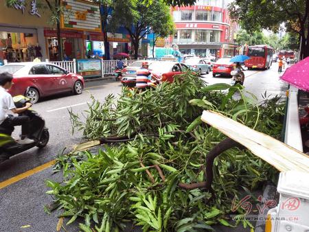A broken tree blocks the bus lane on the Jincheng Middle Road in Hechi, Guangxi, on July 14. [Photo by Long Long/hcwang.cn] |