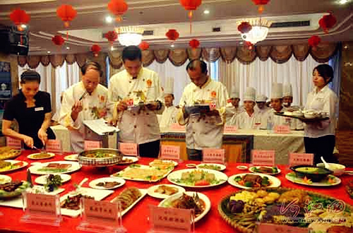 Judges from Guangxi Cooking and Catering Industry Association taste and appraise the special dishes of Bama, Hechi. [Photo by Luo Rongyu/hcwang.cn] |
