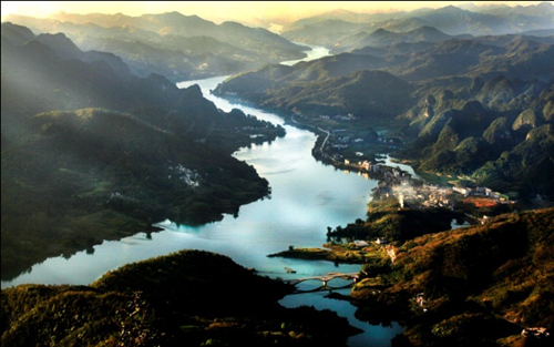 | Hongshui River winds its ways through the mountains. [Photo by Wei Ludong/Hechi Daily] |