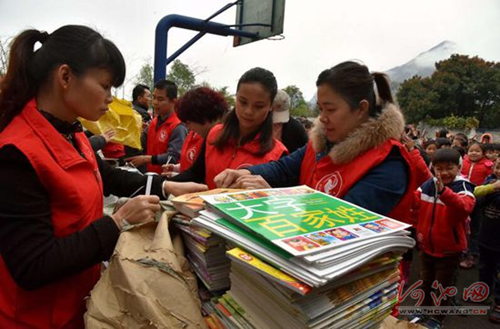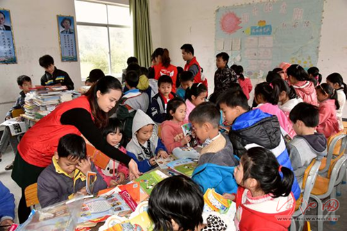 Volunteers give out the books to children at Xingli Primary School in Hechi, Guangxi Zhuang autonomous region. [Photo by Gao Dongfeng/hcwang.cn] |