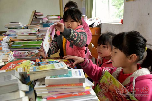 Students happily look through books at Xingli Primary School. [Photo by Gao Dongfeng/hcwang.cn] |