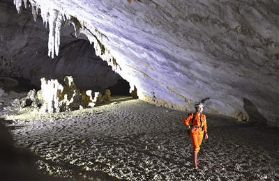 A Chinese explorer walks across one of the "halls" found in the one-kilometer-long karst cave network. [Photo by Wei Ludong/Hechi Daily] |