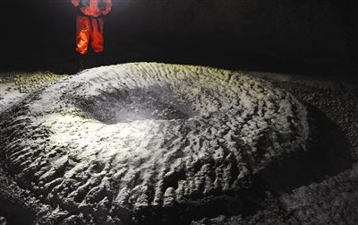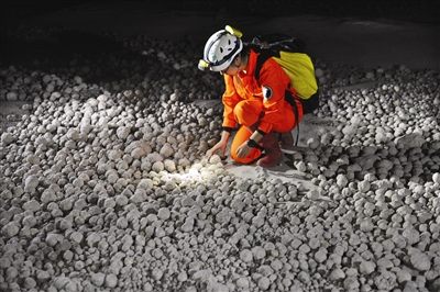 A Chinese explorer examines bead-shaped rocks found on the cave floor. [Photo by Wei Ludong/ Hechi Daily] |