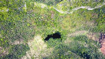 With the help of drones, explorers also discovered a gigantic sinkhole – the Ganyan Tiankeng (literally meaning "heavenly pit") – tucked away in thick forest by the Hongshui River. Steam can be seen rising from the bottom of the 350m-deep, 150m-wide sinkhole.