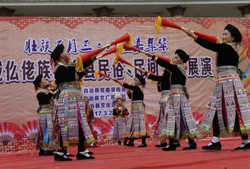 Performers from Luocheng Mulam autonomous county in Hechi staged a show tour in the county on March 26, performing Mulam folk traditions in celebration of the Shangsi Festival.