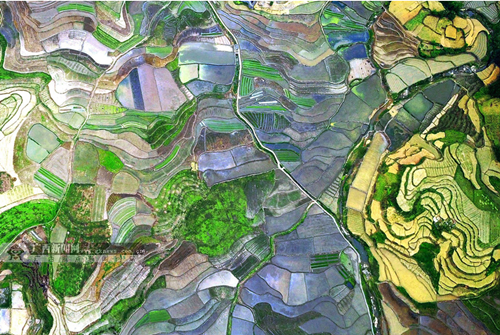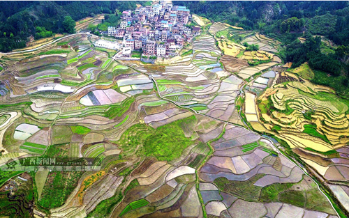 The landscape of Ganfeng village in Luocheng Mulao autonomous county resembles an oil painting when viewed from the air, the fields and farm rich in color.