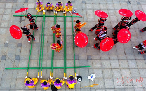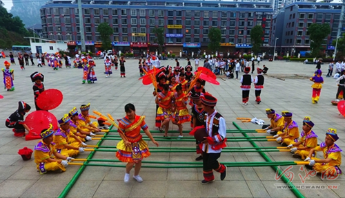 Bamboo dancing is a popular dance that involves hopping over and between bamboo poles as they are manipulated by two to four people. [Photo by Gao Dongfeng/hcwang.cn] |