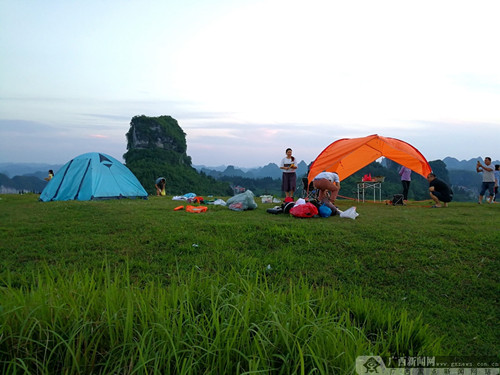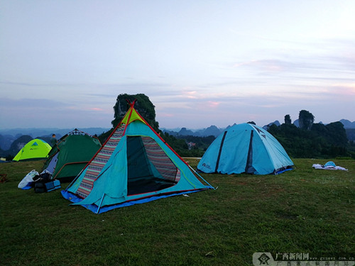 Beautiful views in Gaoshan Grassland attract many campers. [Photo by Liao Guangfu/gxnew.com.cn] |