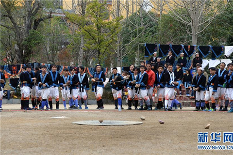 Baikuyao people spin tops to celebrate the local Nianjie Festival, taking place around the fifth day of the first lunar month. [Photo/Xinhua] |