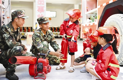 Instructors from the fire brigade in Luocheng Mulao autonomous county, a sub region of Hechi, teach kids basic skills of how to use fire-fighting equipment. The Luocheng county fire brigade set up an open day for the public to learn fire safety on July 22. [Photo/Hechi Daily] |
