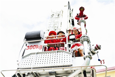 Children climb the fire ladder under the guidance of fire fighters in Luocheng Mulao autonomous county, Hechi. [Photo/Hechi Daily] |