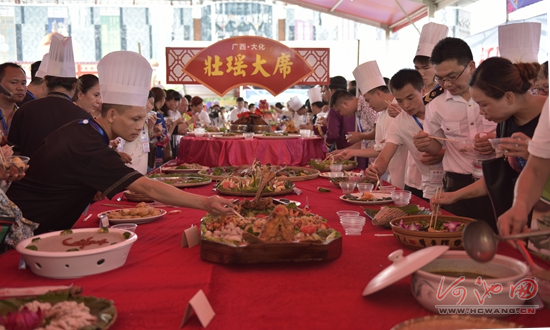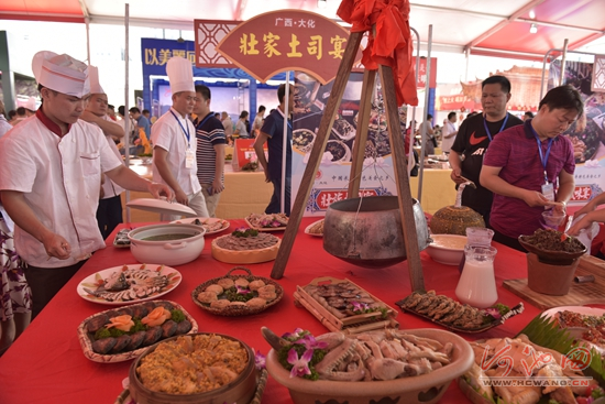 Nearly 600 varieties of hot dishes and local snacks were brought by 58 competitors from across the Guangxi Zhuang autonomous region. Four banquets from Dahua, namely the Zhuang and Yao Grand Feast, the Zhuang Chieftain Banquet, the Yao's Boji Banquet and the Zhuang and Yao Flavor Banquet, claimed the title of "Famous Banquet of Guangxi Cuisine". A total of six entries won the honors.