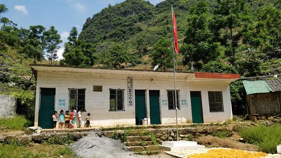 Students stand outside the Bading teaching spot in Dahua Yao autonomous county. [Photo by Nong Guanbin/Xinhua News Agency] |