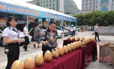 A woman knocks open a "golden egg" for incentives offered by the auto sellers at the seventh Hechi Automotive Trade Fair, Sept 15. [Photo/hcwang.cn] |