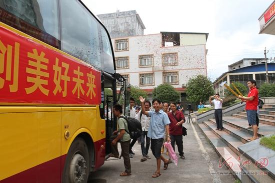 Relocated residents board the bus for China-Malaysia Qinzhou Industrial Park. [Photo by Lu Rongbin/hcwang.cn] |
