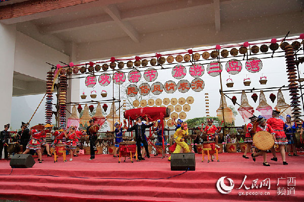 | Performers play bronze drums and dance with the beat. [Photo/gx.people.cn] |
