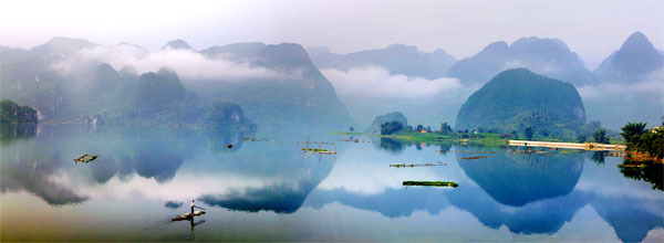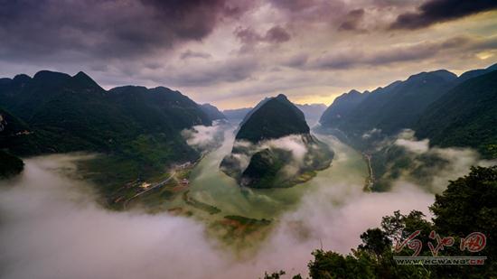 After a steady rain in Donglan county of Hechi, the first bay of the Hongshui River just looks like someone gauzed it into a fairyland.