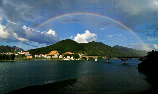 The Hongshui River Bridge and a bright rainbow arched above the Hongshui River after the rain. [Photo/donglan.gov.cn] |