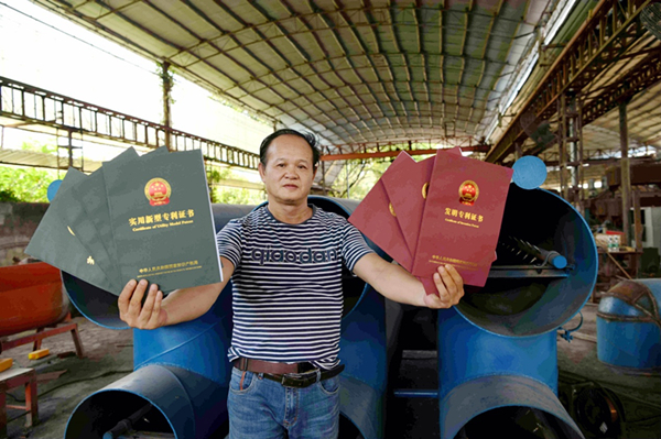 Zhu Xiaozhou showcases his seven certificates of green invention patents. [Photo by Li Ziyu and Gao Dongfeng provided to chinadaily.com.cn] |