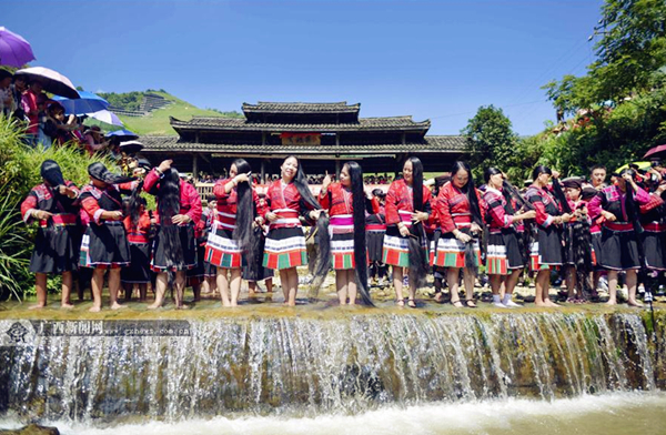 Yao ethnic women wash their long hair in the river on the day of the Sun Clothes Festival. [Photo by Pan Zhixiang/gxnews.com.cn] |