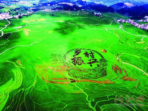 The pattern, using characters to depict the "rural revitalization strategy", a national strategy aiming to promote rural development, was created at the demonstration area of leisure agriculture in Baping. Being abundant in rice production, Nandan county has brought out various themes of paddy field art since 2013, promoting the planting of rice and cultivation of fish and ducks together, all of which increase farmers' incomes and add to poverty alleviation.