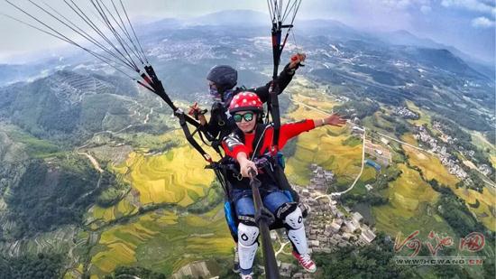 A teenager experiences paragliding accompanied by a coach from Guangxi's first youth aviation flight base in Du'an Yao autonomous county. [Photo/hcwang.cn] |