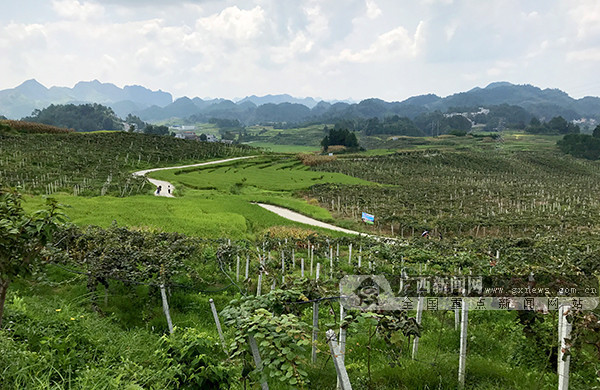 Located in the transitional zone of the Yunnan-Guizhou Plateau, Nandan red kiwifruit cultivating areas have varying temperatures from morning to evening, which is suitable to the growth of the fruit. [Photo by Song Yao/gxnews.com.cn] |