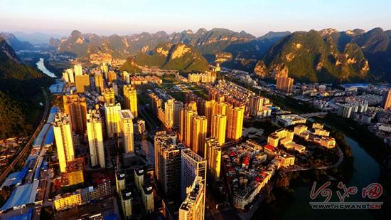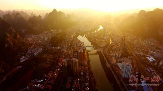 Arranged in close order, the high-rise buildings surrounded by green mountains and clear waters were covered with a golden carpet as the sun set in Jinchengjiang district, Hechi city on Sept 3, showing picturesque views of the wonderland.