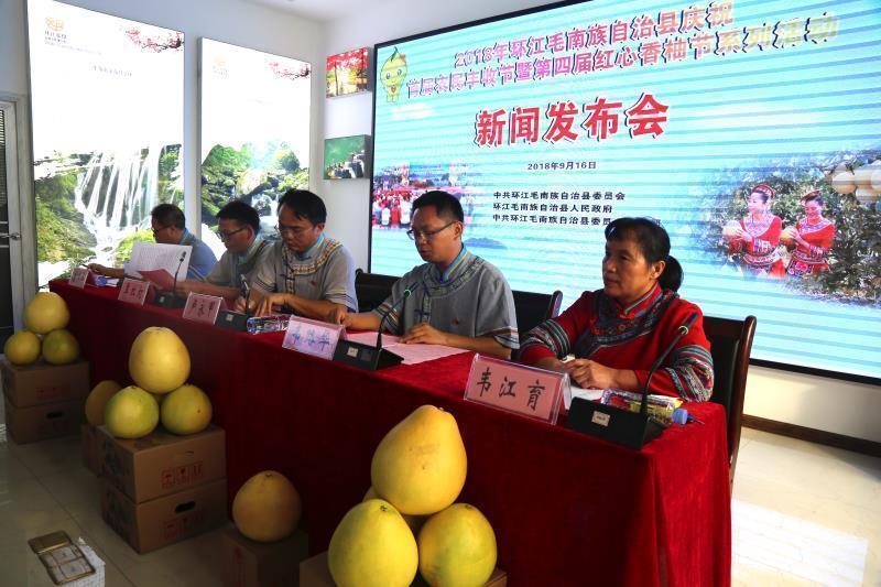 Huanjiang Maonan autonomous county, Hechi, Guangxi Zhuang autonomous region will celebrate the first Harvest Festival, or the forth Huanjiang Red Pomelo Festival from Sept 19 to Oct 7, according to a news conference held on Sept 16.