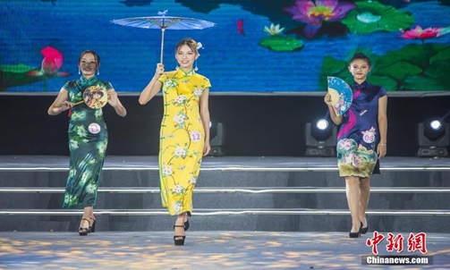 Contestants in Qipao, a form-fitting Chinese dress, during the 68th Miss World China Finals, Guangxi Division, on Sept 22 [Photo by Chen Guanyan/chinanews.com] |