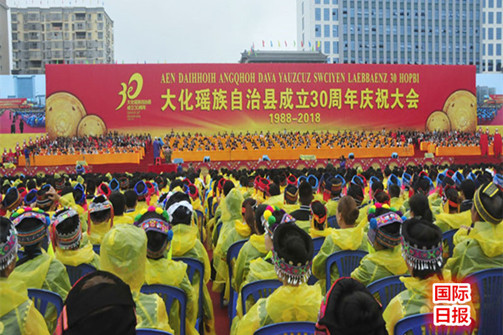 A grand ceremony took place on Oct 20 to celebrate the 30th anniversary of the founding of Dahua Yao autonomous county in Hechi. It was attended by 48,000 government officials and representatives from different ethnic groups.