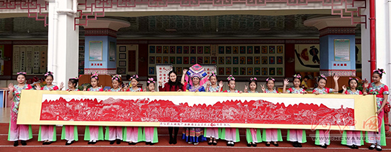 An eight-meter-long paper-cut scroll known as Fairy Singer Liu Sanjie debuted at the First Primary School in Yizhou district, Hechi, Guangxi Zhuang autonomous region, on Nov 8.