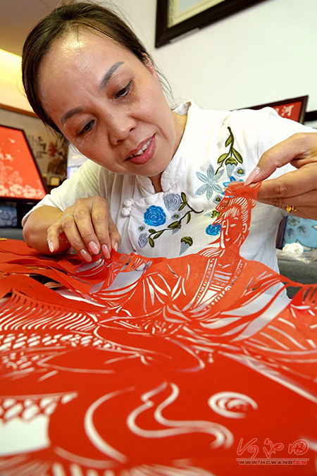 Luo Huaqing showcases her paper-cut work Fairy Singer Liu Sanjie in Hechi, Guangxi Zhuang autonomous region, on Nov 8. [Photo/hcwang.cn] |
