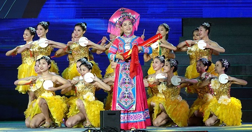 A splendid performance of Yizhou Yugu tunes is staged at the 10th Liusanjie Cultural Tourism Festival, which was held in Yizhou district of Hechi, Guangxi Zhuang autonomous region from Oct 8 to Nov 30, 2019. [Photo provided to chinadaily.com.cn] |