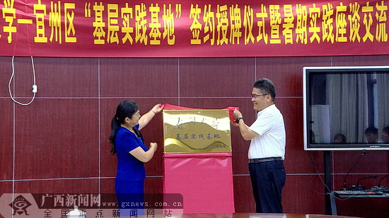 Leaders of Yizhou district and Nankai University unveil the plaque of the grassroots practice base. [Photo by Pan Xinyan/gxnews.com.cn] |