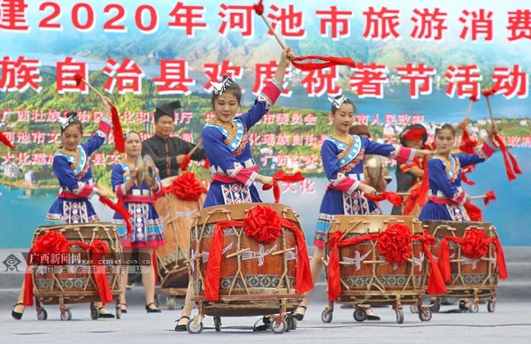 Members of the Yao ethnic group perform a bronze-drum dance at the opening ceremony of the 2020 Dahua Zhuzhu Festival and Hechi Poverty Alleviation Tourism Activity. [Photo/gxnews.com.cn] |