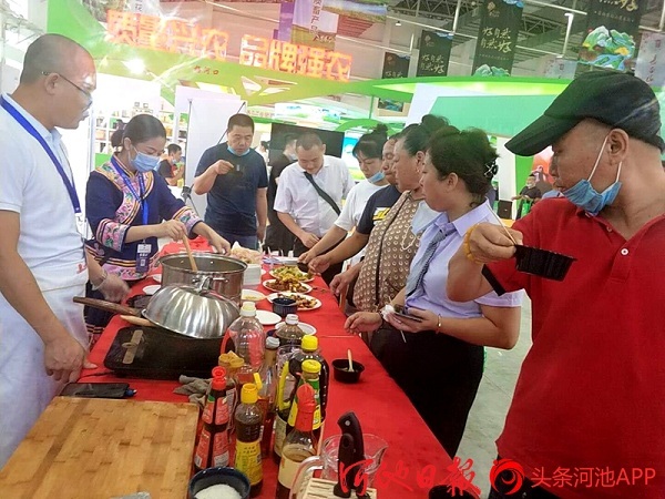 Visitors taste products from Fengshan county, Hechi at the 19th Changchun International Agriculture & Food Expo held in Changchun, Jilin province. [Photo/Hechi Daily] |