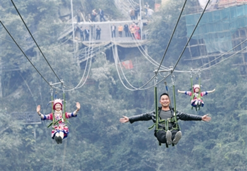Tourists take cable cars at the Mianhua Tiankeng Scenic Spot in Luocheng Mulao autonomous county, Hechi. [Photo/Hechi Daily] |