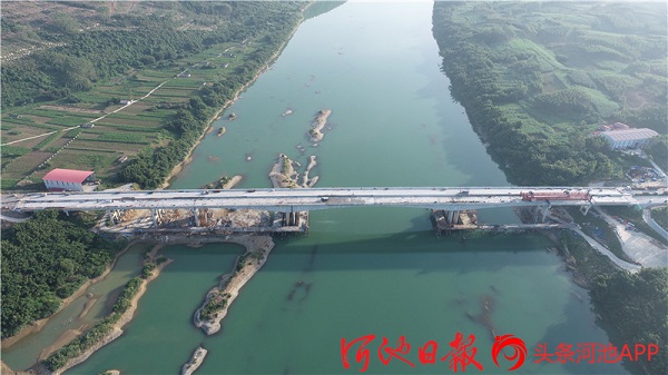 With the successful completion of the beam erection construction task of the Rongjiang Bridge on Oct 24, the Rongshui-Hechi Expressway has completed all construction of its important nodes, achieving the double-width penetration of the expressway.