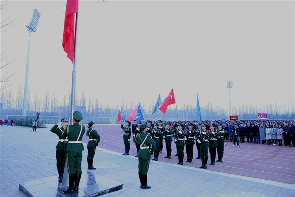 Students of IMNU's flag guard salute the national flag during a ceremony to mark the start of the new semester at Inner Mongolia Normal University in Hohhot, capital of North China's Inner Mongolia autonomous region, on March 4.